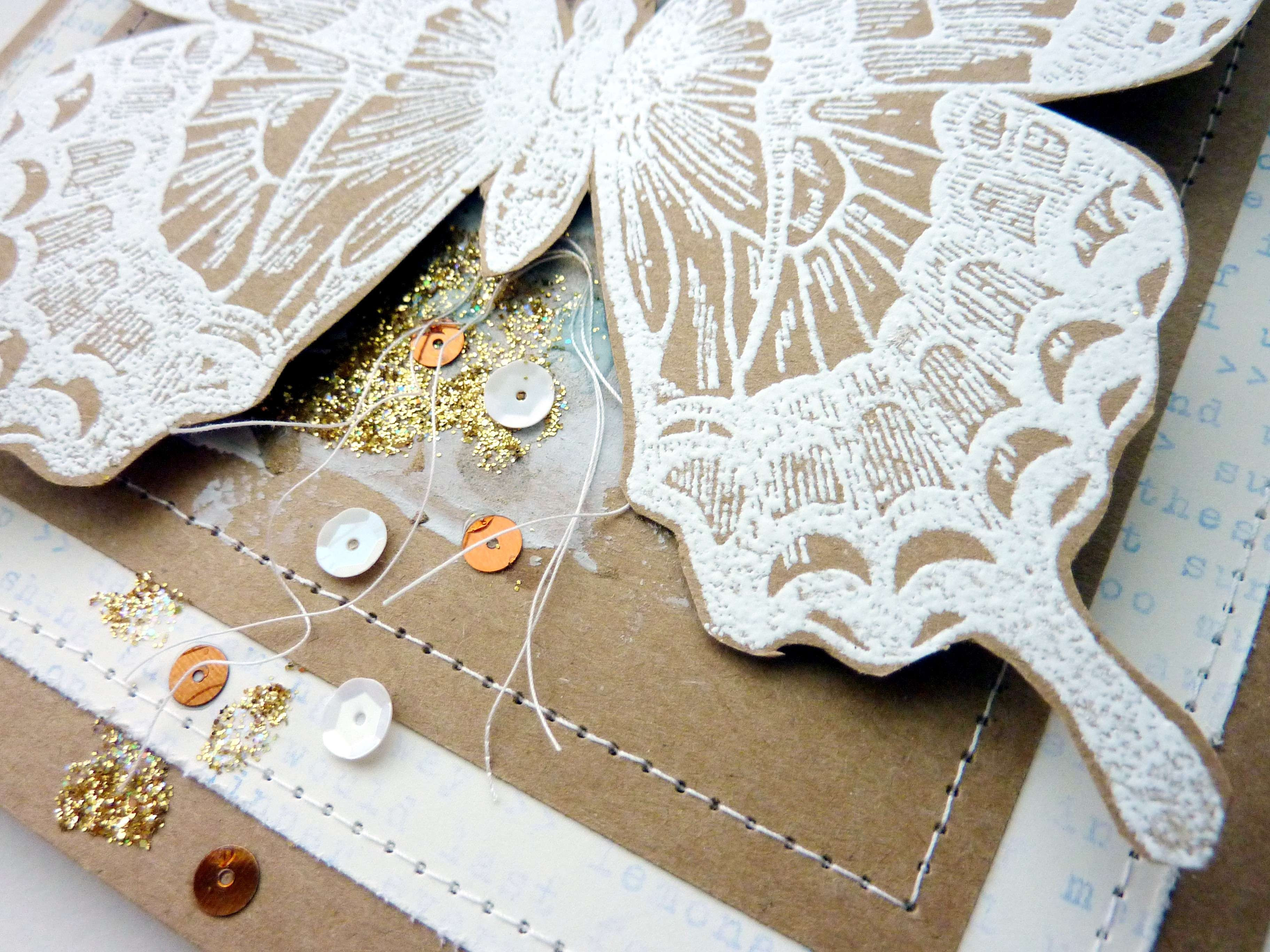 The huge butterfly is stamped and heat embossed with white embossing powder. I cut it out and glued it on the card using foam pads.The envelope is decorated in the same style.
